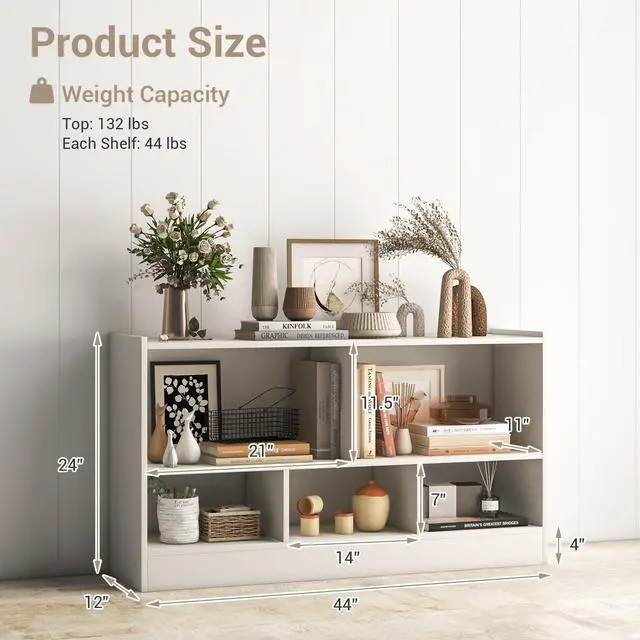 Versatile Storage Solution: Featuring 2 compartments and a lower tier with 3, the horizontal bookcase offers a practical storage solution with an upper tier. This divisional design caters to a range of item sizes, from books and decorative items to larger objects, providing flexibility in how you organize and display your belongings (Cube Dimensions: 11D x 21W x 11.5H / 11D x 14W x 7H)