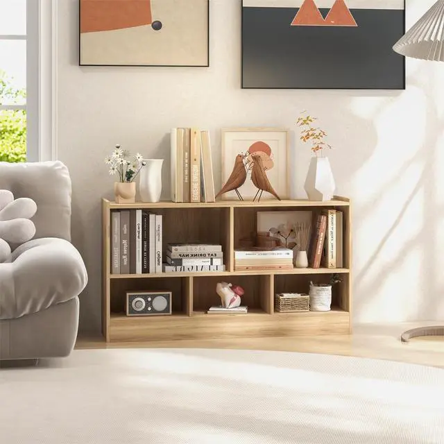 Versatile Storage Solution: Featuring 2 compartments and a lower tier with 3, the horizontal bookcase offers a practical storage solution with an upper tier. This divisional design caters to a range of item sizes, from books and decorative items to larger objects, providing flexibility in how you organize and display your belongings (Cube Dimensions: 11D x 21W x 11.5H / 11D x 14W x 7H)