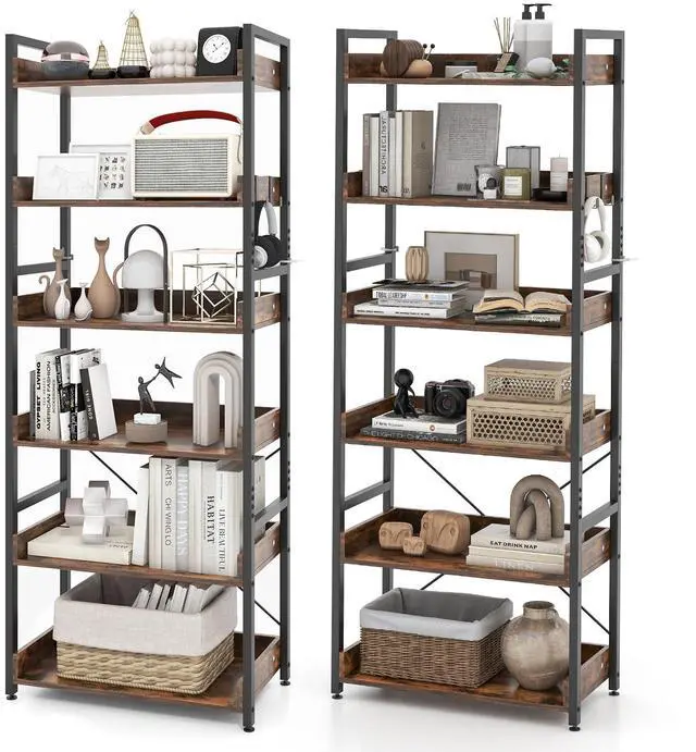 6-tier Bookshelf with 4 Hooks: The industrial bookcase features 6 open shelves to enlarge storage and display space for items, such as books, decorations, photos and potted plants, etc. 4 hooks are convenient to hang your headphone or toys, which can well suit diverse storage needs.