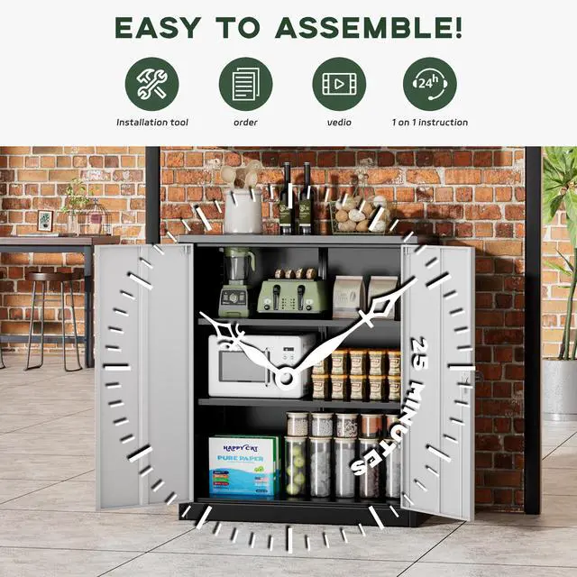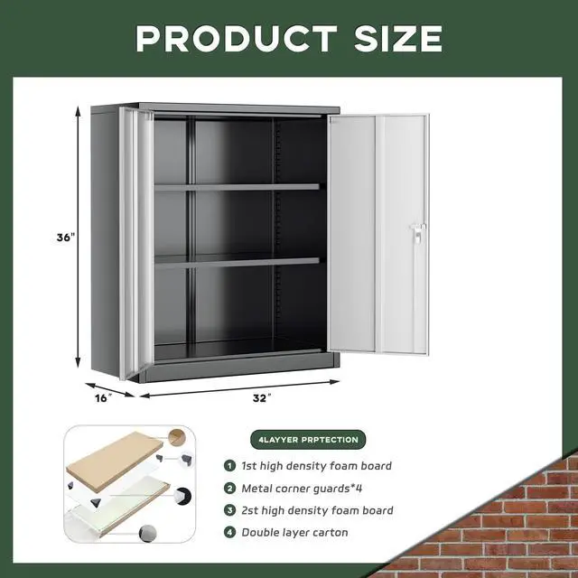[Multiple Usage Scenarios]:This looking cabinet (36"H x 32"W x 16"D) with 2 doors and 2 adjustable shelves.Because of its modern, simple and compact design, it is suitable for placement anywhere, such as home, school, kitchen, office and so on.It is a good choice for component storage system members.