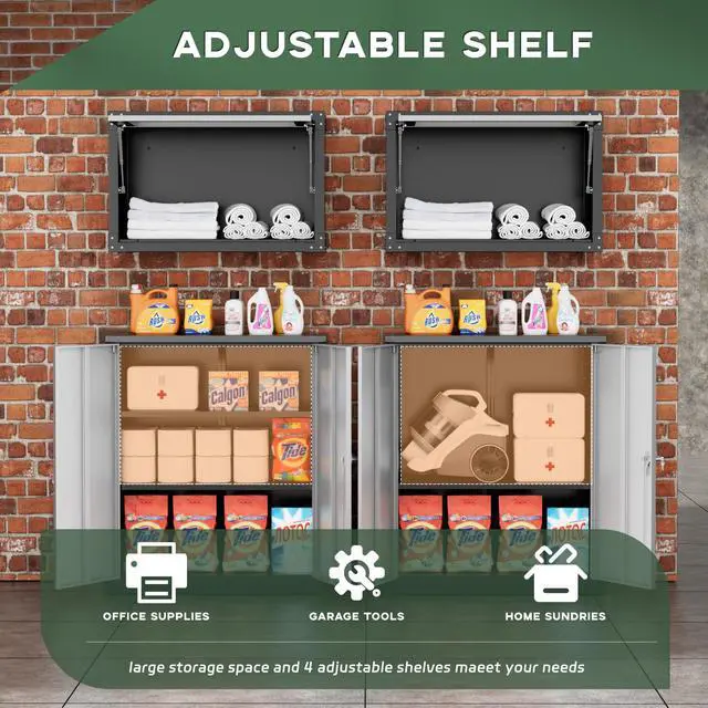 [Locking Design]:The steel garage storage cabinet with the silver handle and lock block on the side cabinet door, the overall create a modern style.Meanwhile, we provide 2 keys, the lock block is designed to effectively protect your various valuable documents and belongings.