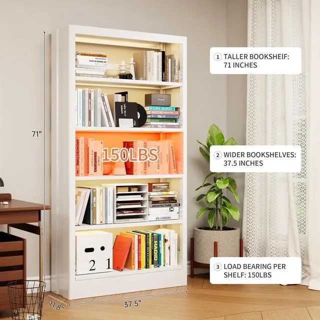 [Modern and Minimalist Design] With sleek, clean lines and an elegant design, our cold-rolled steel 5 tier bookshelf perfectly complements any modern home or office space. Whether in an open studio or a compact study, this bookshelf library adds a touch of sophistication and enhances the overall interior decor