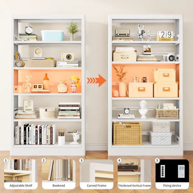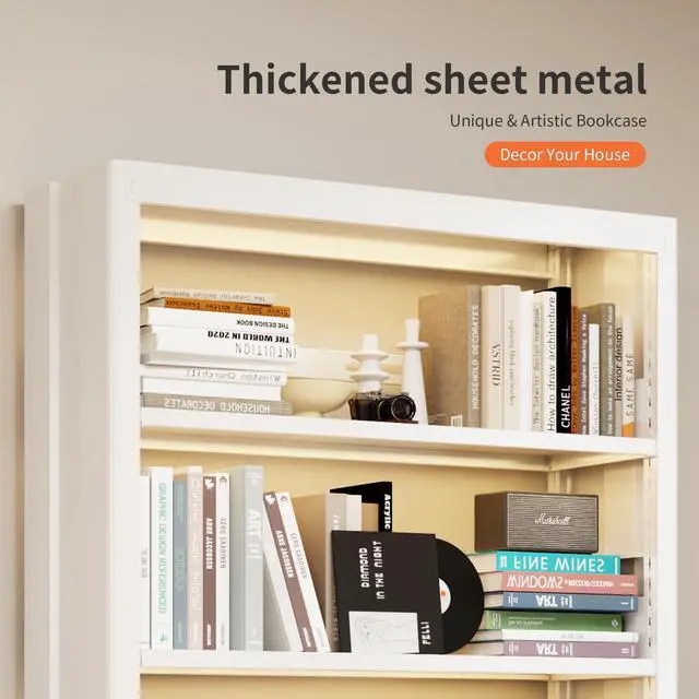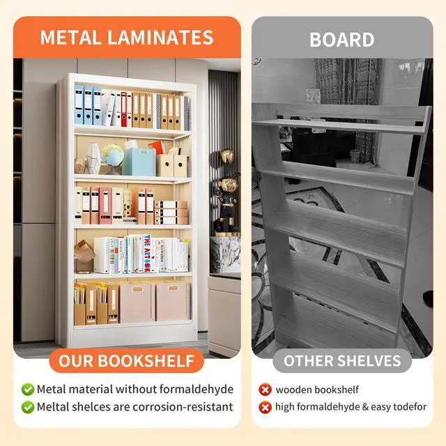 [Durable and Robust Structure]Crafted from high-quality cold-rolled steel, this metal bookcase boasts exceptional stability and load-bearing capacity. Enhanced connectors further increase its overall load-bearing ability, ensuring that the metal bookshelf can handle heavier items with ease. The specially treated surface is resistant to corrosion and scratches, making it easy to clean and maintain. This ensures that our white bookshelf remains in pristine condition for years to come