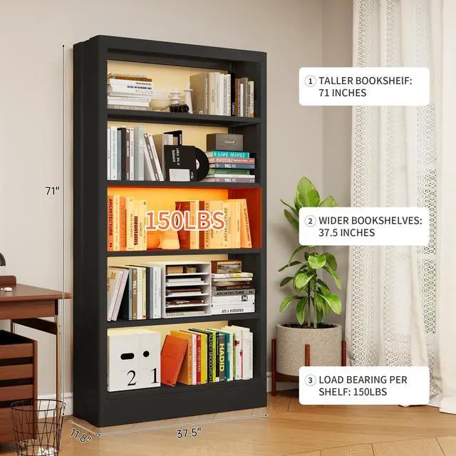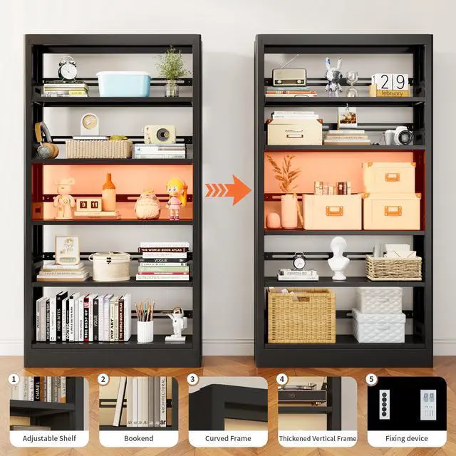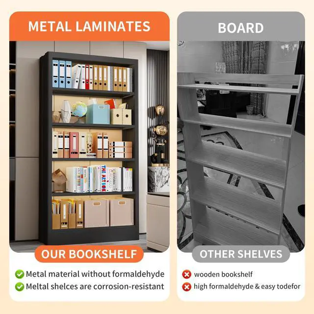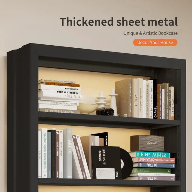 [Modern and Minimalist Design] With sleek, clean lines and an elegant design, our cold-rolled steel 5 tier bookshelf perfectly complements any modern home or office space. Whether in an open studio or a compact study, this bookshelf library adds a touch of sophistication and enhances the overall interior decor