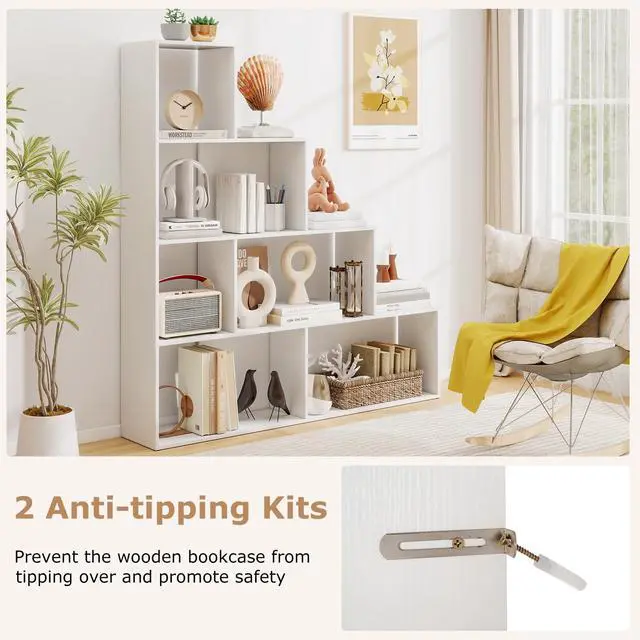 Reinforced Safety: The stair bookshelf is equipped with 2 anti-tipping kits to prevent it from tipping over, adding an extra layer of safety in spaces. Moreover, the anti-slip foot pads prevent slipping on surfaces and ensure stability.