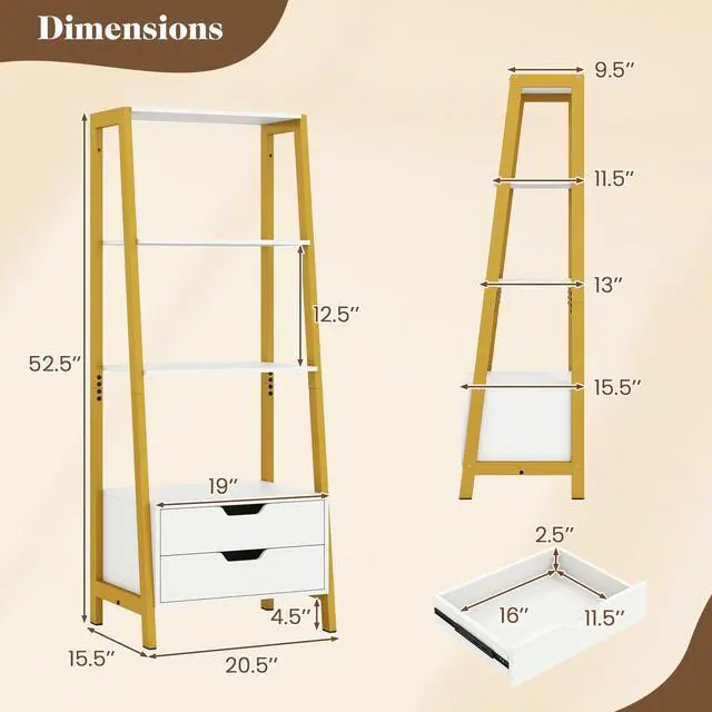 Maximize Your Space: Enjoy 4-tier open shelves and 2 spacious drawersperfect for showcasing your favorite books, treasured photos, and stylish plants. This ladder bookshelf is your perfect organizational companion!