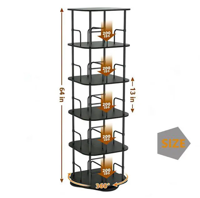 360° Rotating Design & Space-Saving Efficiency Featuring a smooth steel turntable base, this 5 tier rotating bookshelf enables 360° silent rotation for easy access to books, decor, or office suppliesperfect for small spaces. With dimensions of 15.75" L x 15.75" W x 63.78" H, its narrow, vertical tower design occupies just 0.43 sq ft while offering storage for 120+ medium-sized books or display items. Maximize corner spaces in bedrooms, living rooms, or home offices with this space-efficient black rotating bookshelf.