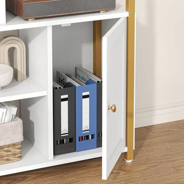 Semoic 6-Tier Bookshelf with Door, 71.1" Tall Industrial Book Shelf with Metal Frame & 9 Open Display Shelves, Large Display Shelving Unit, White Geometric Book Shelf for Lving Room, Home Office