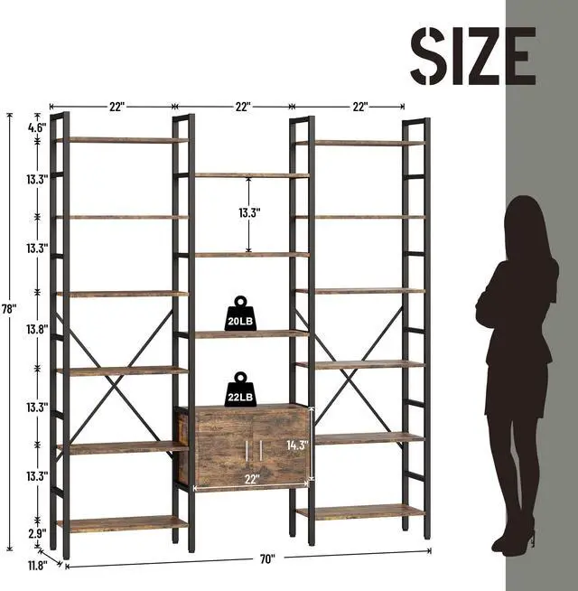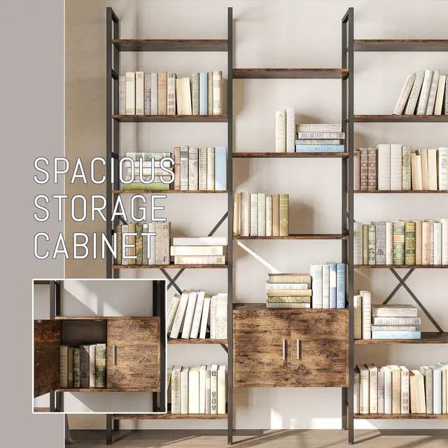 70x78 Triple 6 Tier Book Shelf, Industrial Large Bookcase with Storage Cabinet, Tall Bookshelf with 16 Open Display Shelves Metal Frame Furniture for Living Room Bedroom Home Office Brown
