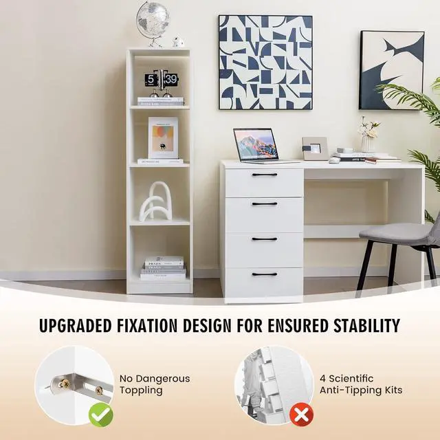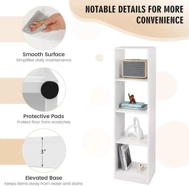 56" Tall 5 Tier Narrow Open Display Bookshelf, 4 Cube Storage Unit with 4 Stabilizing Anchors,Wooden Cube Storage Organizer for Small Spaces, Pantry, Dorm Rooms, Bedrooms, White
