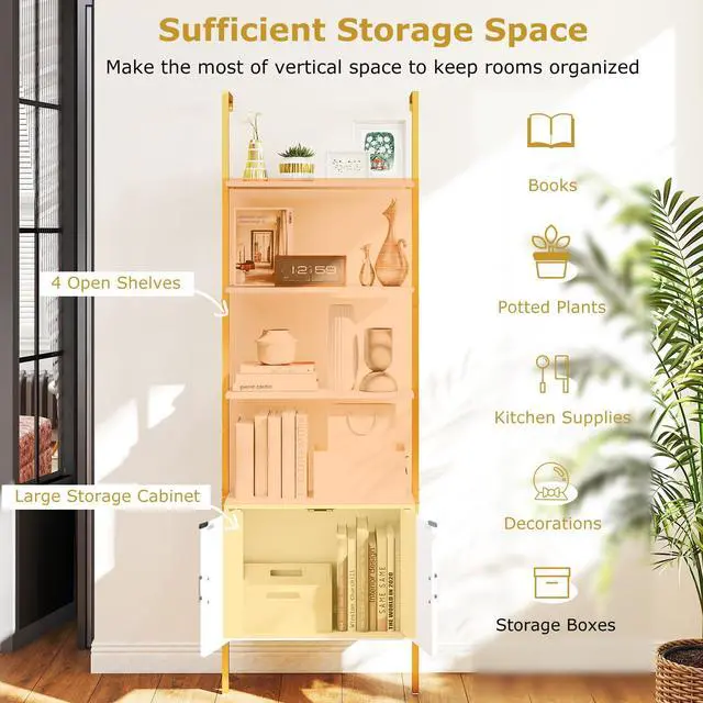 Sufficient Storage Space: With 4 open shelves and a large storage cabinet, this wall ladder shelf can make the most of vertical space to keep rooms organized. It is perfect for holding your books, potted plants, kitchen supplies, decorations or storage boxes, ensuring all your daily items are easily accessible.