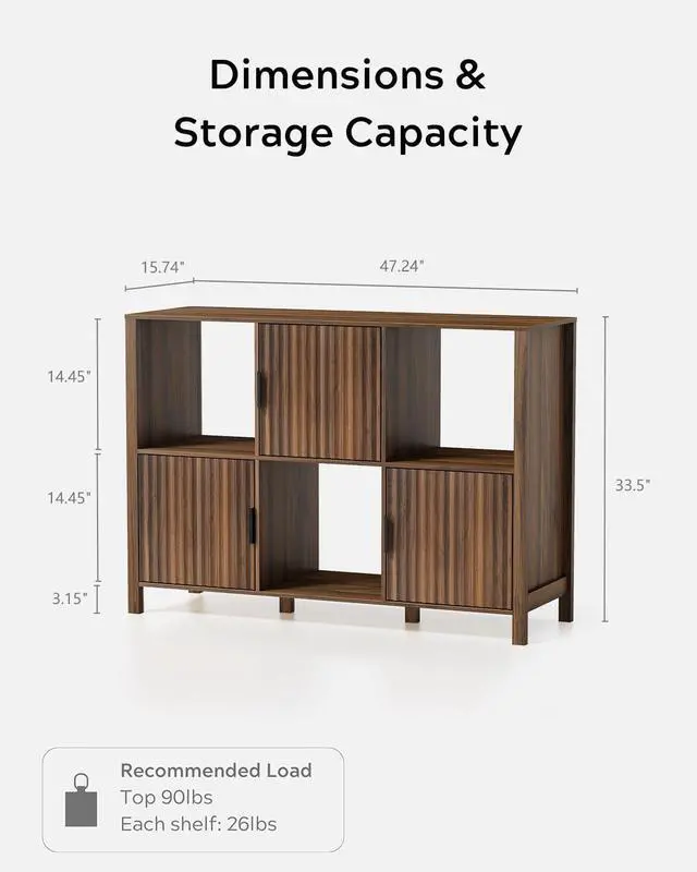 Fluted Storage Organizer Bookshelf, Modern Cube Bookcase with 3 Open Shelf and 3 Cabinets with Doors for Bedroom, Living Room, Office, Brown