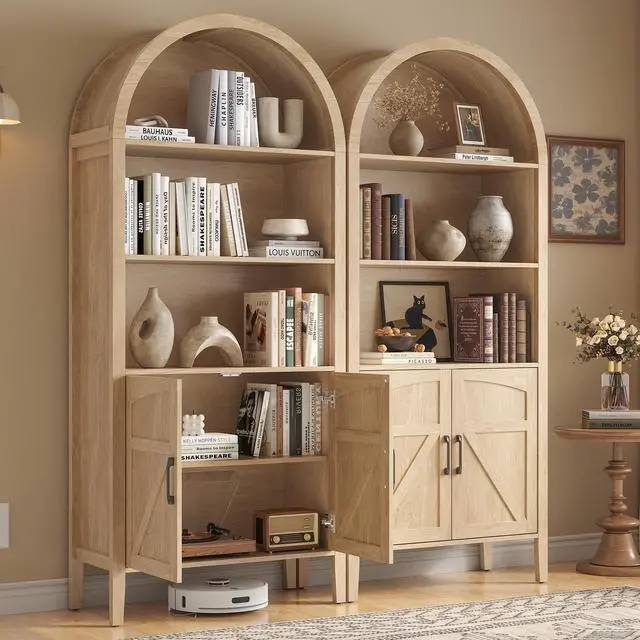 MULTIPLE USAGE BOOKCASE: This arched cabinet can be used as a bookshelf, display cabinet, wine cooler, storage cabinet, or pantry cabinet to meet different needs. Open and closed storage cabinets accommodate both display and privacy needs, providing a functional and stylish addition to any living space.