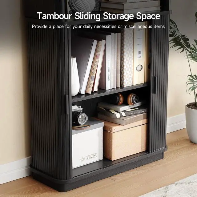 CONCEALED STORAGE CABINET: This bookshelf has a tambour sliding storage cabinet; the unique sliding doors allow for the concealed storage of items, offering a balanced combination of open display space and hidden storage for a clutter-free and organized interior.