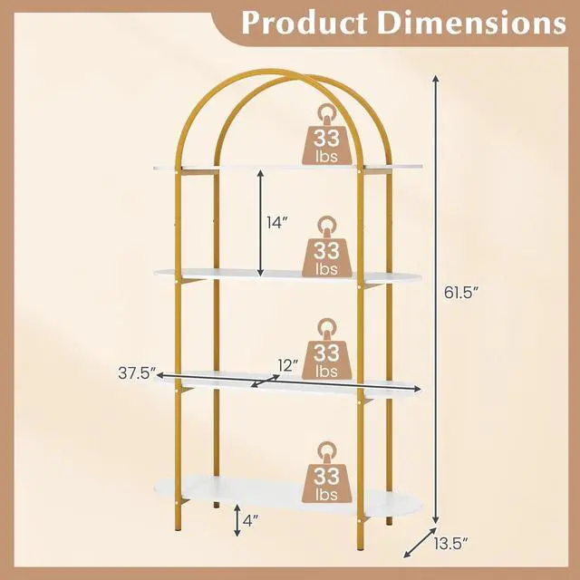 Tangkula 4 Tier Arched Bookshelf, 61.5 Tall Storage Bookcase with Open Display Shelves & Metal Frame, Industrial Modern Freestanding Storage Rack for Bedroom, Living Room, Office (1, White)