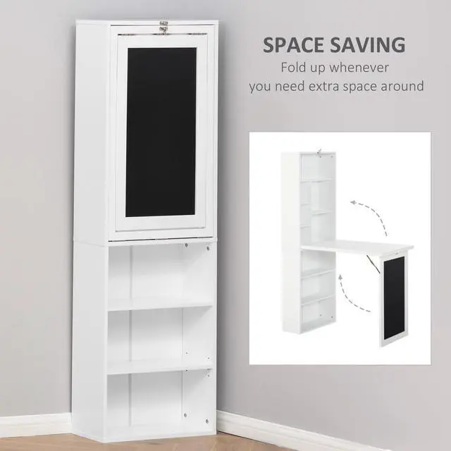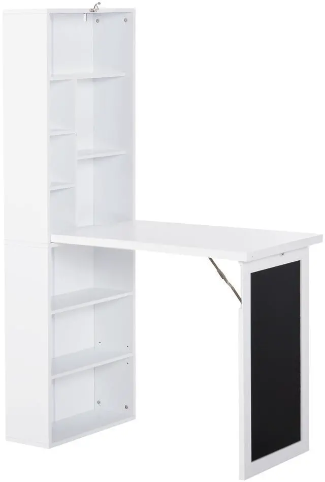• Fold-out Convertible Writing Table Wall Mount Desk Cabinet with Blackboard and Side Shelf Multi-Function Home Office Workstation, White