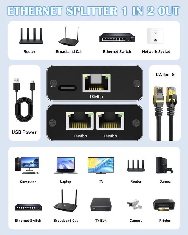 ![]() Ethernet Splitter 1 to 2 | ![]() Ethernet Splitter 1 to 3 | ![]() Internet Splitter 1 to 4 | ![]() With 2Pack Cat6 Cable | ![]() With 2Pack Cat6 Cable | ![]() With 2Pack Cat6 Cablet | ![]() RJ45 Ethernet Coupler |