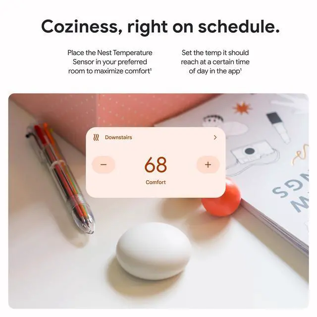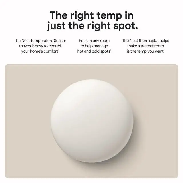 The Nest Temperature Sensor (2nd gen) makes it easy to manage hot and cold spots throughout your home. Just put it in a preferred room and get the right temp right where you want it. It's battery powered, so you can set it, then forget it's even there. [1] And it works with the Nest Learning Thermostat (4th gen), Nest Learning Thermostat (3rd gen), and Nest Thermostat E. [1, 4].