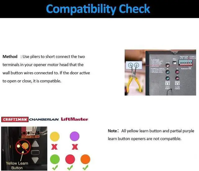 EASY INSTALLATION WITH WIDE COMPATIBILITY,Huacaoe Garage Door Opener can compatible with most major garage door openers, please Test Compatibility Before Order: Take a wire with both ends stripped or a straightened-out paper clip and put each end to the same terminals as the wall button wires are terminated to. By doing so, if your door activates, then your garage door opener is compatible with by default. If the door does not activate, then the opener is not compatible by default.