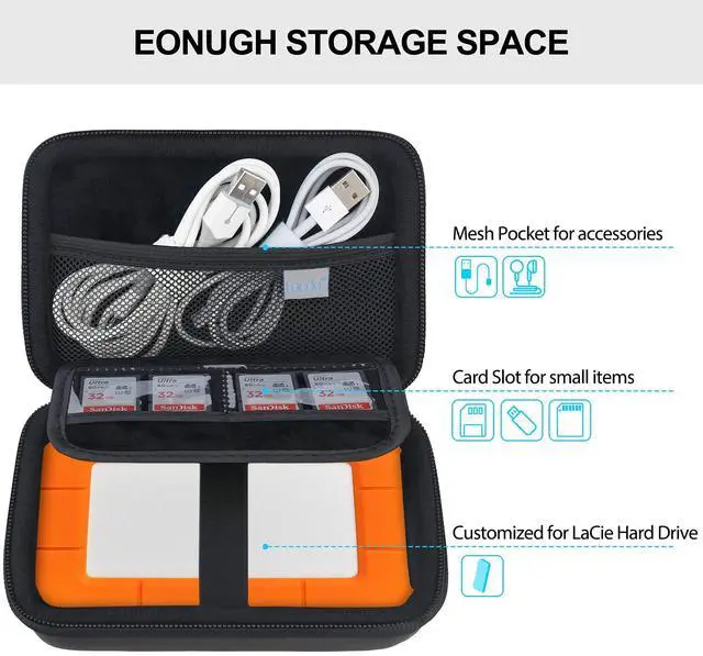 - Mesh pocket built into the case to store your USB cable, charger, and other practical accessories also boast extra plastic slots to place SD and memory cards or other smaller but essential items. Every item stays now super clean, well-organized, and safe!