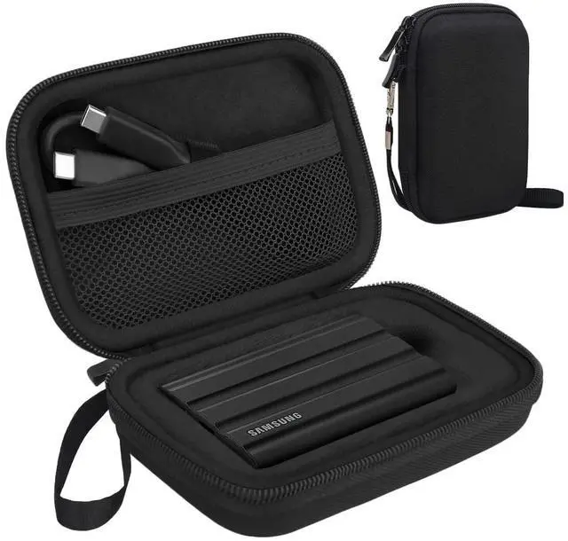 The t7 shiled case is made of water-resistant and shockproof Canva and EVA material shell that protects your Samsung T7 Shield Solid State Drives agains damage from splashing and dropping.