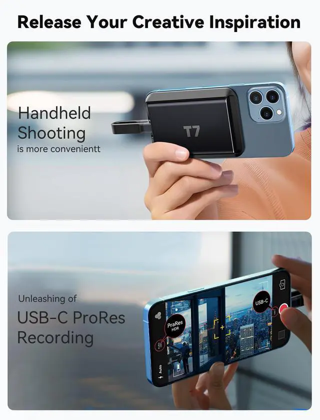 The iPhone 15 Pro & Pro Max have opened up a new world for content creators at every level with the unleashing of USB-C ProRes recording. You can record high-resolution ProRes video, but only if the data is going directly to an external SSD. You dont want the drive dangling from the phone, so we developed a magsafe SSD case for samsung T7 that magnetically clings to the handset. Connect the two via a USB-C cable and youre ready to start recording.