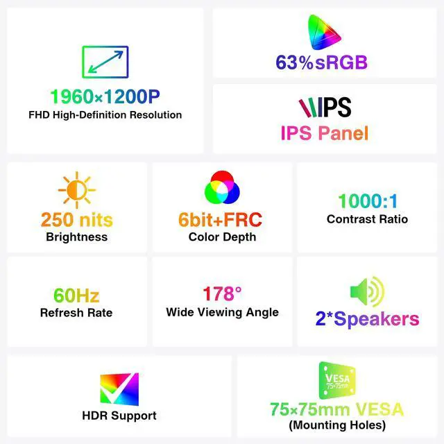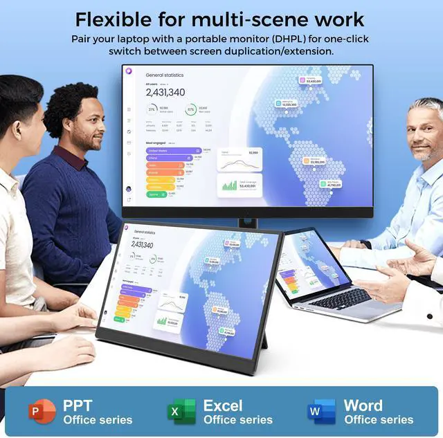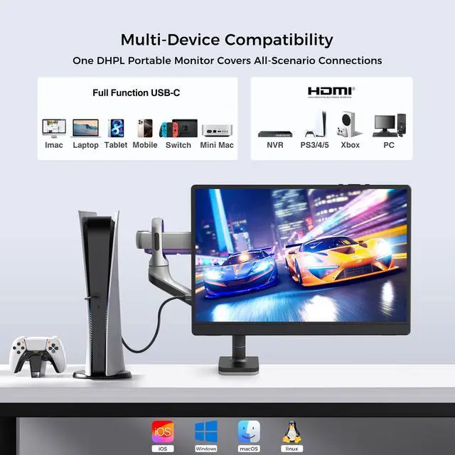 14-Inch FHD Portable MonitorThis DHPL portable external monitor for laptops features a 1920×1200P FHD resolution, 178° wide viewing angle, HDR support, and an eye-care IPS panel with low blue light. It delivers vivid and sharp image quality while reducing eye strain during prolonged use, making it ideal for both work and entertainment