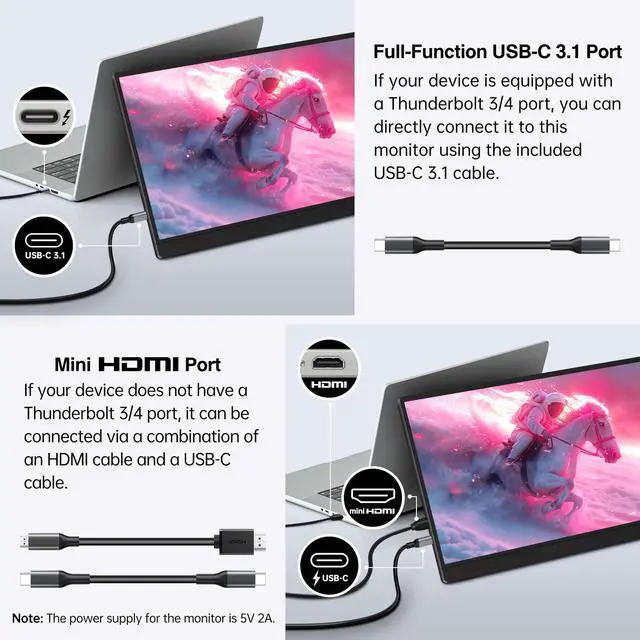 Dual Full-Featured Type-C + Mini HDMI PortsFor seamless plug-and-play functionality, this DHPL portable monitor is equipped with 2 USB-C ports (supporting 2-in-1 functionality: power supply and video transmission) and 1 mini HDMI port. Simply connect it to your device using a single USB-C cable, and its ready to use instantly. NOTE: Please ensure your device supports USB 3.1 Type-C DP ALT-MODE (DisplayPort Alt Mode) or Thunderbolt 3.0/4.0 to unlock full functionality