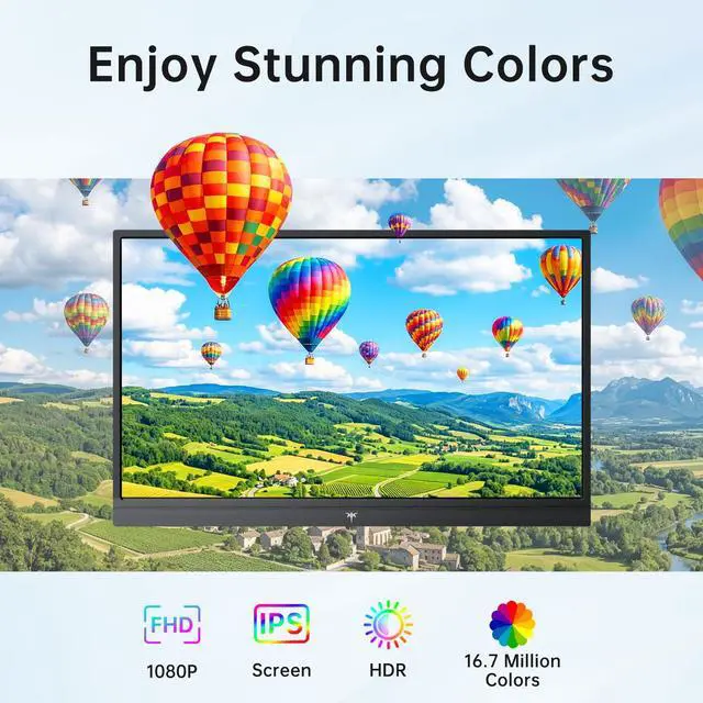Stunning Visual Experience15.6 inch FHD portable monitor features a high-quality IPS panel with HDR, delivering high color accuracy and crisp details. 1000:1 contrast ratio, 300 cd/m² brightness, and 16.7 million colors provide smooth color transitions, ideal for both work and entertainment.