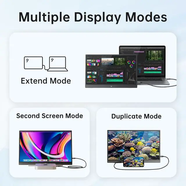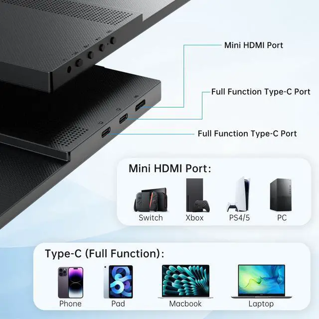 Wide CompatibilityThis portable monitor for laptop supports duplicate, extend, and second screen modes, effectively expanding your workspace. Compatible with laptops, phones, mini PCs (Mac Mini, iMac), Xbox, PS4/5, Switch, and other devices, meeting all your daily needs.