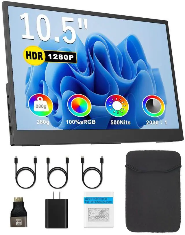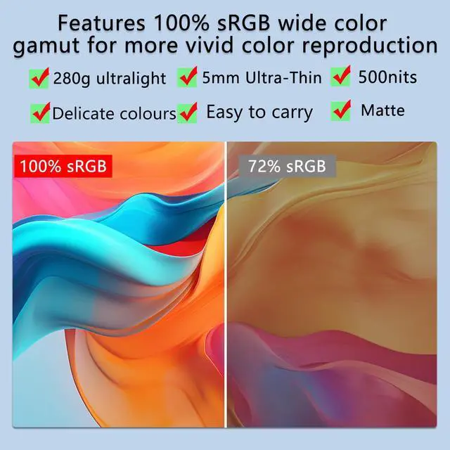 Full HD Portable Monitor1920*1280 Full HD portable monitor delivers high-quality visuals with 500 nits brightness, 2000:1 contrast ratio, 100% sRGB coverage, and a 178-degree wide viewing angle. This minimizes distortion and color shift regardless of viewing position or angle, ensuring beautiful images from any perspective. With a fast 60Hz refresh rate, it handles fast-paced content like FPS games and action movies smoothly.