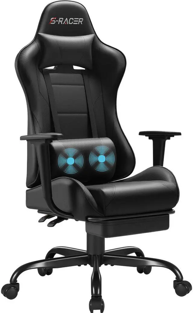 Gaming Chairs, Computer Chair with Footrest and Massage Lumbar Support, Height Adjustable Game Chair with Headrest and Swivel Seat (Black)