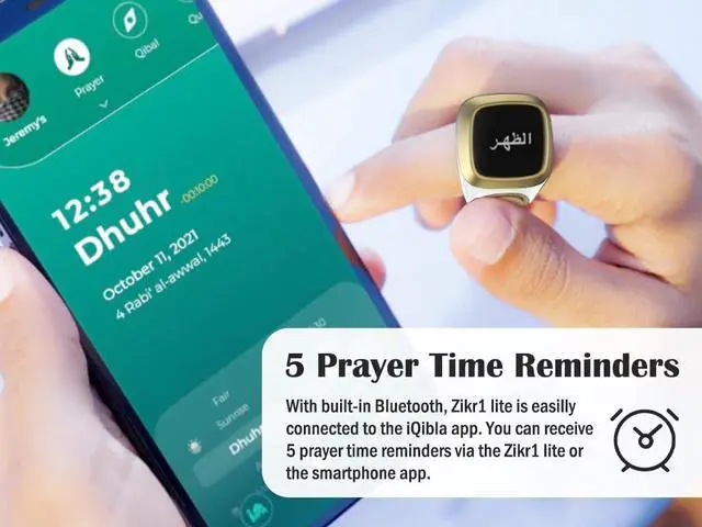 The smart ring counter tasbih has a built-in 0.49" OLED display showing the time, number of chants and prayer times.