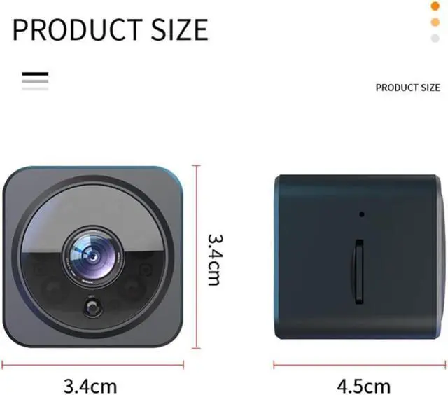 The length of this mini camera is 3.4cm, width is 3.4cm and thickness is 4.5cm.