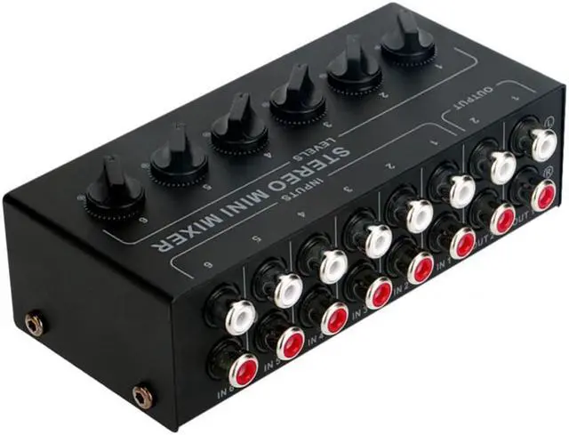 It is a stereo six-way passive mixer for extended control tuning, mixing instrument, CD player, tape player, computer, mobile phone, tablet and so on. No battery or other power source required. The device can also be used as 2 In 6 Out stereo distributor clockwise to adjust the volume.