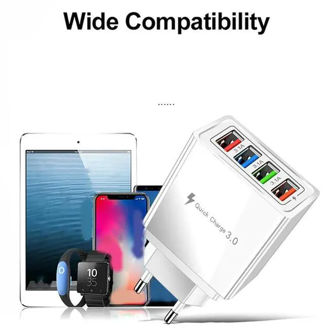 4X 4 USB Fast Charging Adapter, With LED Light Fast Charge Charger 5V3A Charger Type-C QC 3.0 Fast Charge Adapter(US