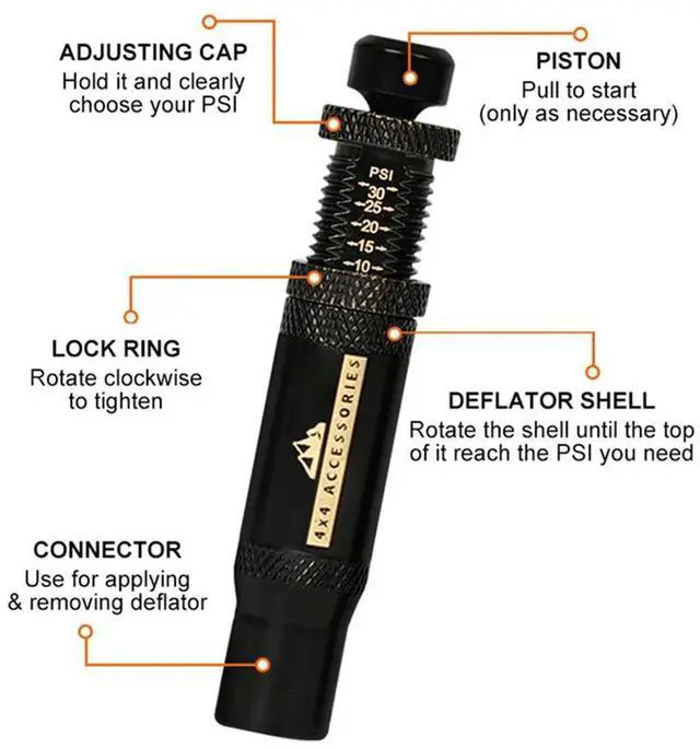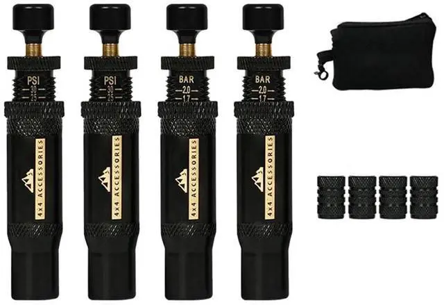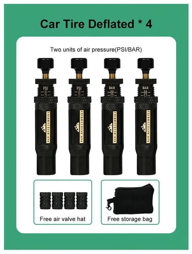 • Adjustable Auto-Stop Tire-Deflator Valve Kit (10-30 PSI) 4 PCS Screw-on Tyre Air Down Tool for Vehicles Motorcycle