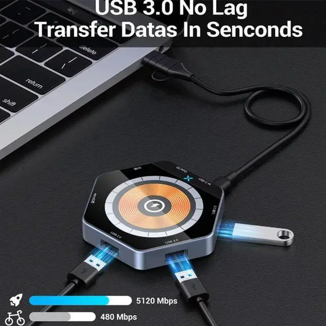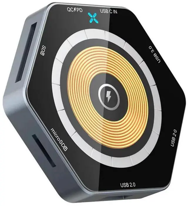 • 7 In 1 HUB Type-C USB3.0 Dual Connectors 7 Ports 15W Fast Wireless Charging QC3.0 Super Charge TF SD Card Reader