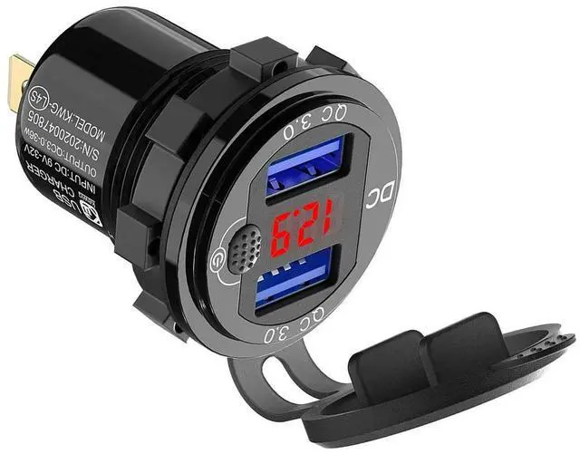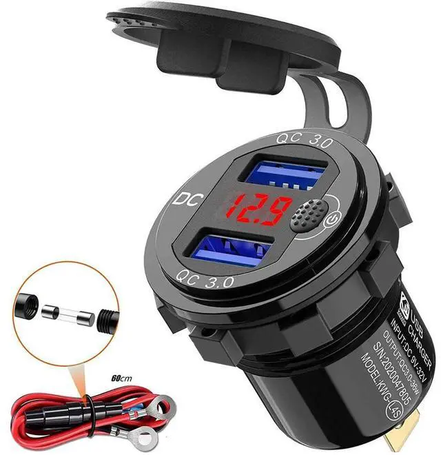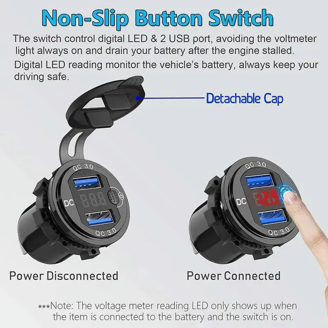 4X Quick Charge 3.0 Dual 12V USB Car Charger, Aluminum Socket With Switch Button And Red Digital Voltmeter, Waterp