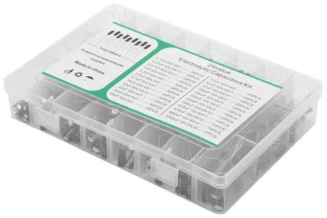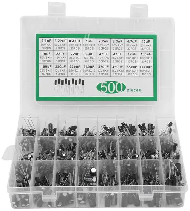 • 500Pcs 24Values 16-50V 0.1-1000uF Assortment Box Kit Assorted Assortment Kit l Electrolytic Capacitors Bypass Low Frequency
