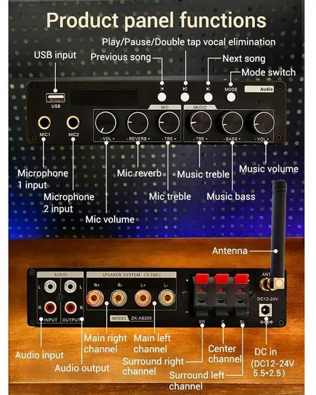 • 200W ZK-AS200 Bluetooth Power Amplifier Board Module Digital Audio Amplifier KTV 5.1