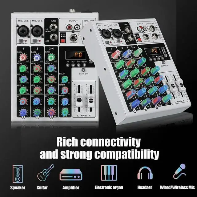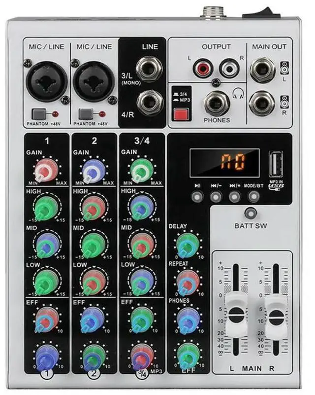 • 4 Channels Mixing Console Portable DJ Karaoke Audio Mixer XLR Bluetooth 48V Phantom Power For PC MP3 Recording EU PLUG