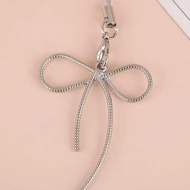 1Pc Korean Y2K Simple Silver Bow Phone Charm Bowknot Lanyard Cell Phone Chain Keychain Accessory for Girls