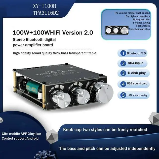 XY-T100H Bluetooth 5.0 TPA3116D2 100Wx2 Stereo HIFI Audio Module Parts With Front High-Bass Adjustment