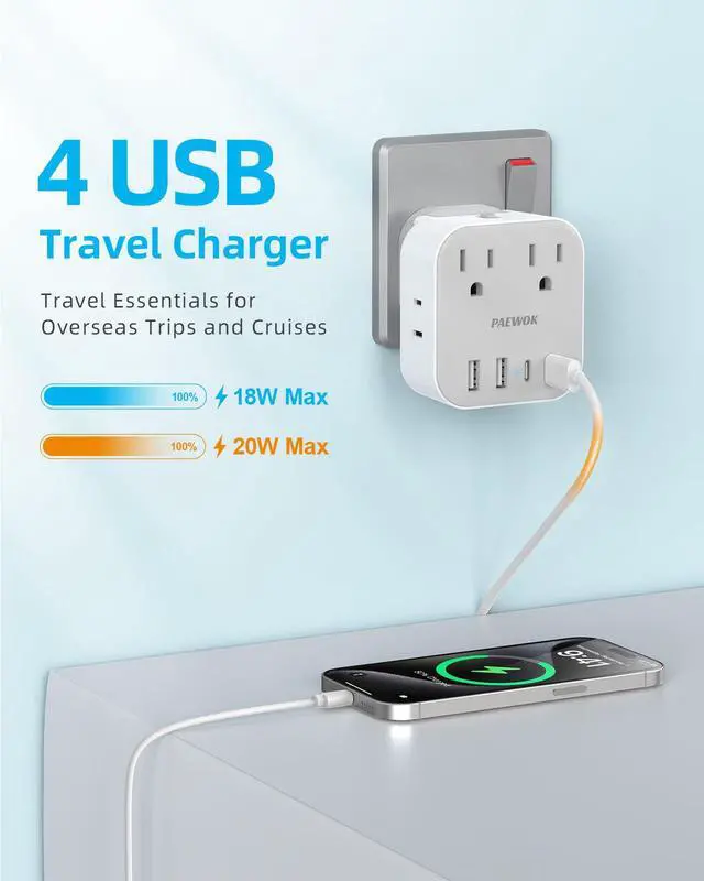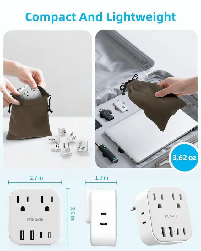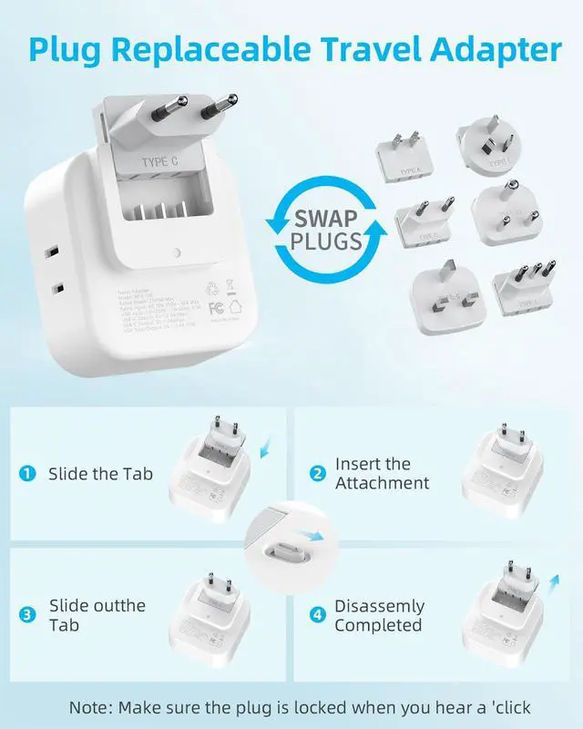 Travel adapter can be easily installed or removed in two simple steps: press inward and slide downward until a secure lock is achieved. Note: Ensure the plug is fully locked by confirming an audible 'click' sound.
