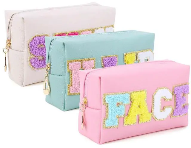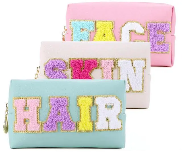 • 3PCS Face Hair Skin Bag with Patches Chenille Letter Cosmetic Pouch Zipper Closure PU Leather for Women for Travel Accessories