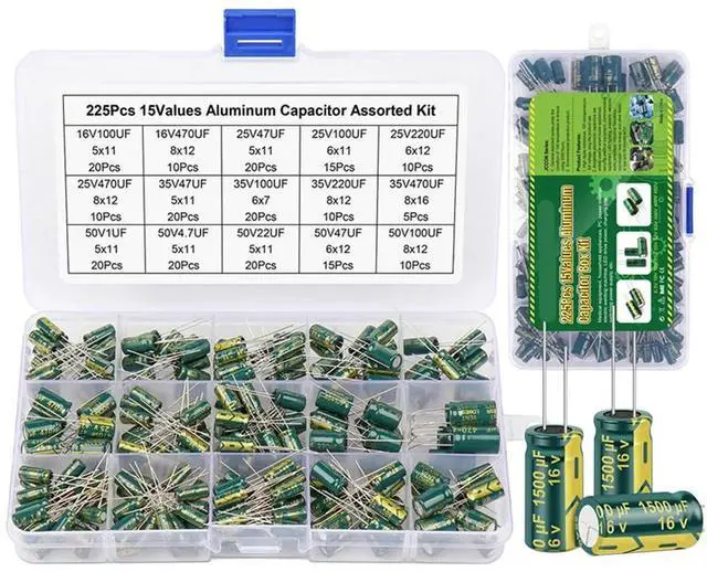 • 15Values 225Pcs Aluminum Capacitors Set High Frequency Low ESR Electrolytic Capacitors Assortment Kit 16V-50V with Box