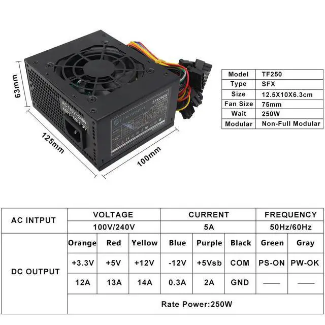 • 250W Power Supply 50hz/60hz SFX 110V/240V 5A Non-Full Modular Active PFC 75MM Silent Fan High Efficiency Excellent Power Supply