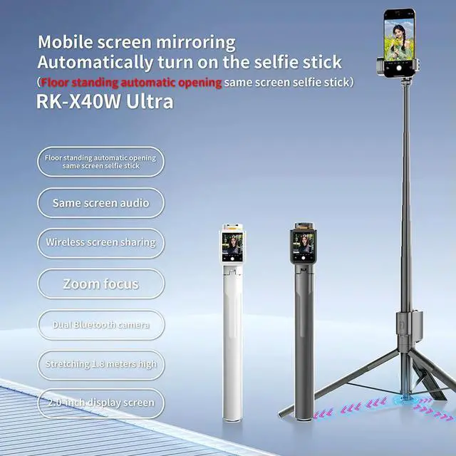 • RK-X40W Selfie Stick Tripod Phone Stand BT5.2 Handheld RC Selfie Stick Projection Screen Tripod Real Time Display Selfie Monitor