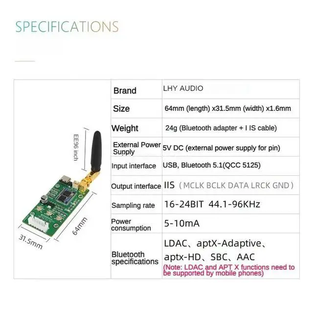 • QCC5125 Bluetooth 5.1 USB Type C Input Conversion Board Adapter Plate I2S IIS Output 96KHz
